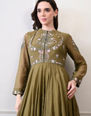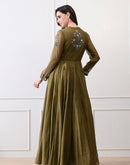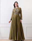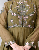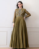 An elegant olive gown with exquisite floral and ornate embroidery adorning the bodice and cuffs, featuring a gracefully flowing ghera.