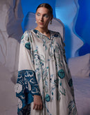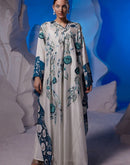 Ivory kaftan featuring 3D applique and cutdana work at both front and back, adding a touch of opulence to this style