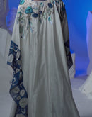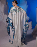 Ivory kaftan featuring 3D applique and cutdana work at both front and back, adding a touch of opulence to this style Fabric: Cotton Silk  Embroidery details: 3D applique & cutdana...