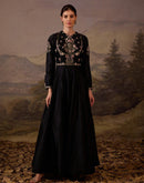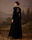 An elegant black gown with exquisite floral and ornate embroidery adorning the bodice and cuffs, featuring a gracefully flowing ghera.