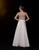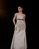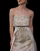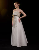 This sophisticated strapless gown showcases intricate gold embroidery on the bodice and central panel, accentuated by a structured overlay.