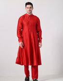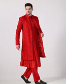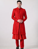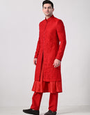 Make a bold statement with this vibrant red Indo-Western sherwani. Featuring a richly silk thread embroidery, front-slit design, and a classic mandarin collar, it pairs perfectly with matching kurta and trousers for a regal and modern ethnic look. Ideal for weddings, receptions, or festive celebrations