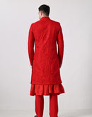 Make a bold statement with this vibrant red Indo-Western sherwani. Featuring a richly silk thread embroidery, front-slit design, and a classic mandarin collar, it pairs perfectly with matching kurta and...
