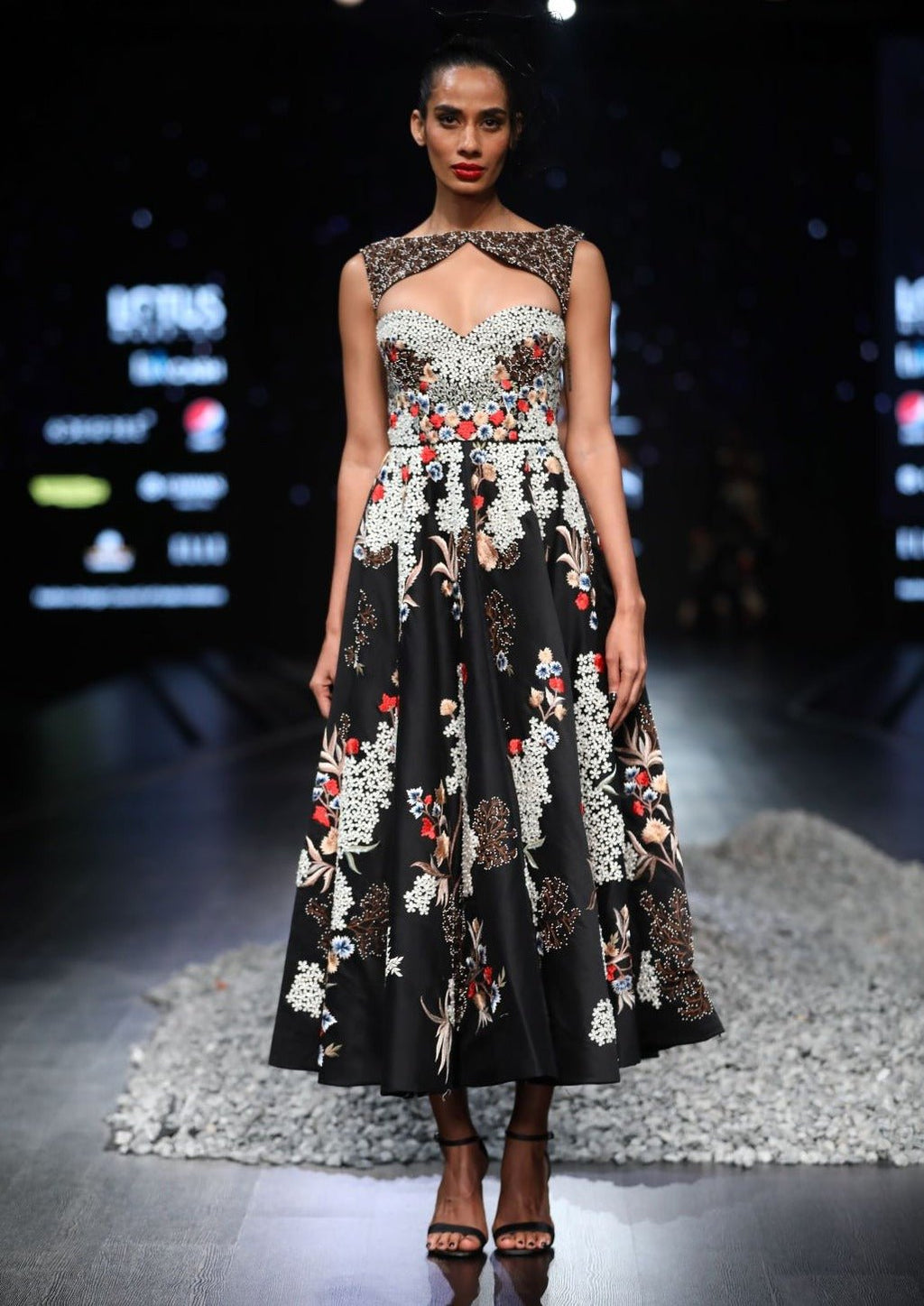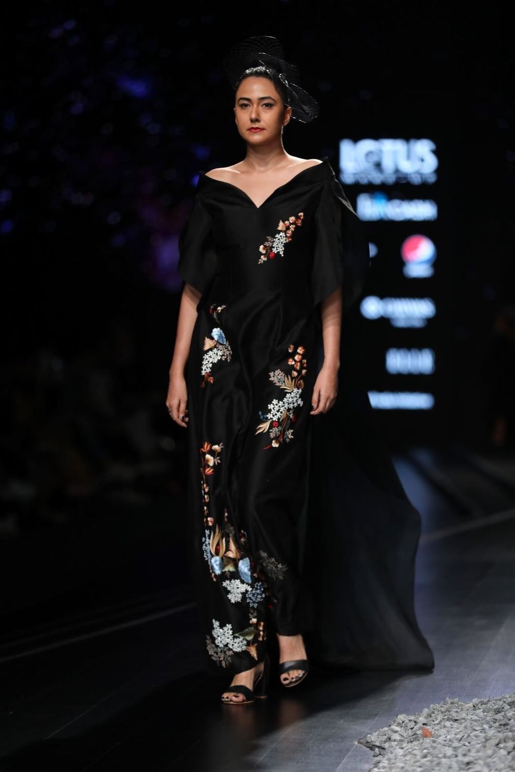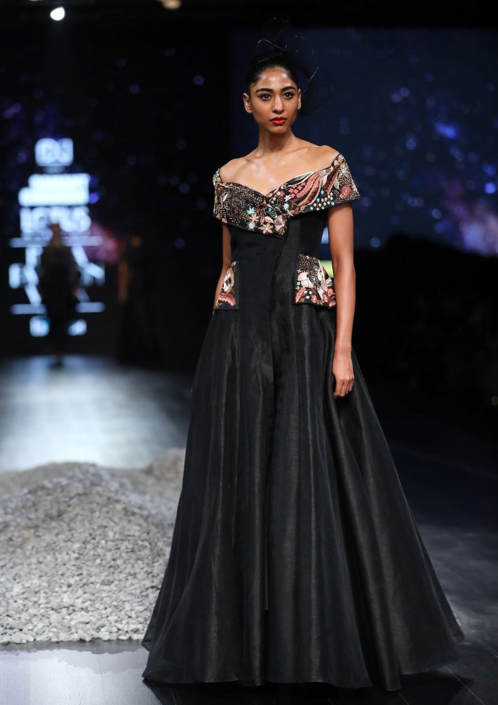 Black sweetheart neckline fit & flare off-shoulder cotton silk gown embroidered floral motifs