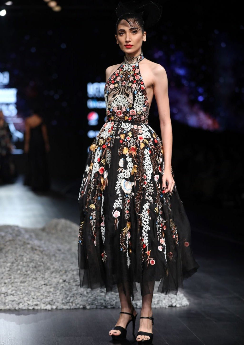 Silk thread floral embroidery organza silk halter neck gown
