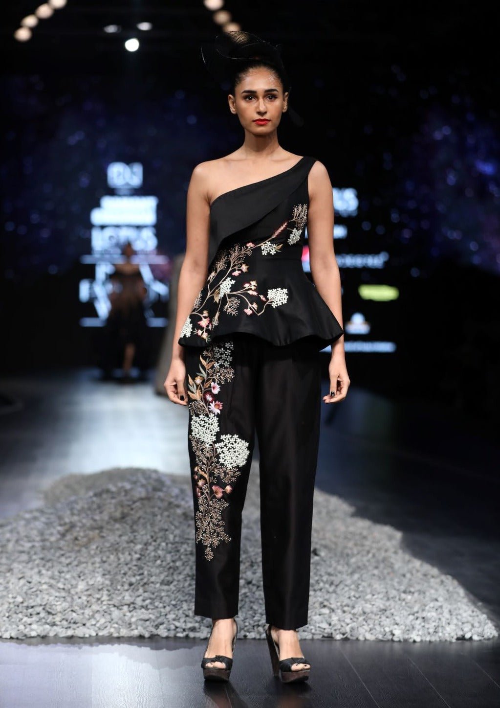 One shoulder, corset-style peplum top with pants in cotton silk that is embellished in thread embroidery.