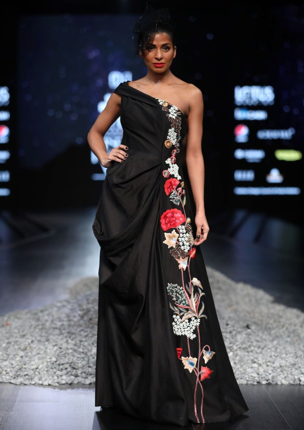 Silk thread floral embroidery pleated one shoulder gown
