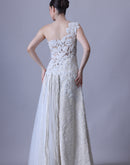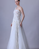 This one-shoulder ivory gown showcases intricate floral appliqué, delicate sheer paneling, and a flared tulle insert that beautifully blends timeless elegance with modern flair.