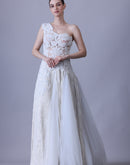 Ivory one-shoulder gown with sheer accents and floral appliqué. – samantchauhan