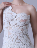Ivory one-shoulder gown with sheer accents and floral appliqué.