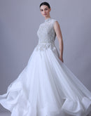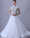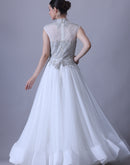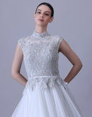 This sleeveless gown features a high-neck embroidered bodice with intricate silver detailing and a flared tulle skirt with a structured hem