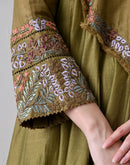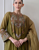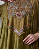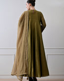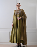 Olive cotton silk Anarkali set paired with matching bottoms and a dupatta, designed with a flowing silhouette and a subtle, elegant sheen