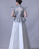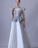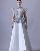 Discover this captivating white gown featuring an intricately embellished silver bodice with a structured neckline and shoulder details