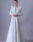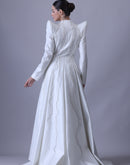 Stunning ivory floor-length gown with a lapel neckline, front open design, and cotton silk fabric, enhanced with exquisite silk thread and Zardozi embroidery.