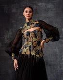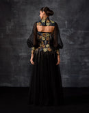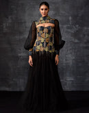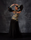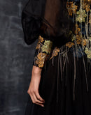 This elegant off-shoulder black gown features a dramatic sleeve cape top, sheer puff sleeves, and intricate gold floral embroidery that cascades into a flowing tulle skirt—perfect for statement-making evenings.