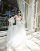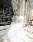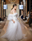 This enchanting off-shoulder gown features a structured embroidered bodice with delicate gold accents and voluminous sheer tulle sleeves. The flowing layered skirt adds a dreamy finish