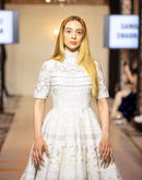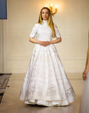 this high-neck gown features half sleeves and intricate threadwork across a voluminous flared silhouette. The soft sheen and subtle embroidery