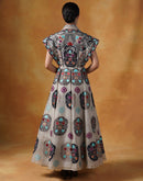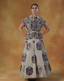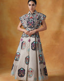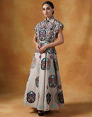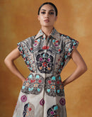 Featured here is a linen silk jacket style pleated gown that is surfaced with beautiful silk yarns & embellished with intricate hand embroidery. It has a collared neckline & extended shoulder panel.