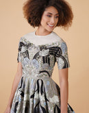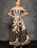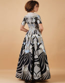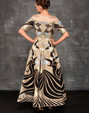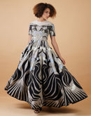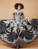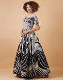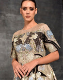 Featured here is a high-neck fit, A-line floor length gown in linen silk that is crafted with appliqué work and beautiful silk and zari yarn.