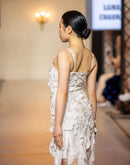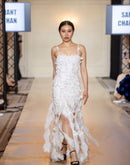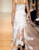 Turn heads in this strappy white gown featuring delicate 3D floral appliqués and a dramatic high-slit hem. The asymmetrical textured layers add a whimsical, nature-inspired touch