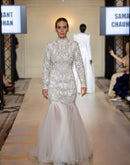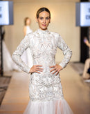 Exude timeless elegance in this high-neck gown featuring intricate silver embroidery and a form-fitting silhouette. The design transitions into a soft tulle mermaid skirt