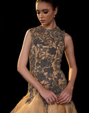 Step into the spotlight with this exquisite gold evening gown that blends ornate elegance with dramatic flair. The sleeveless bodice is richly embroidered with intricate floral patterns in contrasting dark tones, creating a bold yet sophisticated statement