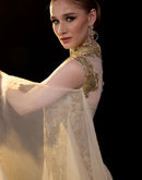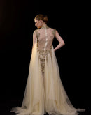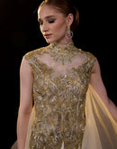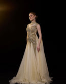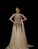 Turn heads and exude sophistication with this stunning embellished gold evening gown. Crafted for elegance and impact, this gown features a high neckline and sleeveless silhouette adorned with intricate gold embroidery and beadwork that shimmers under the light