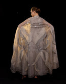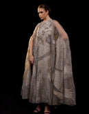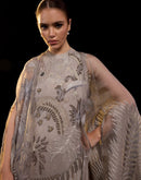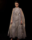 Make a statement in this ethereal embroidered gown, featuring a flowing silhouette and a sheer cape overlay adorned with intricate metallic threadwork. Delicate and regal, this ensemble is perfect for weddings, festive occasions, or formal evening events.