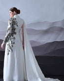 A sculpted ivory gown defined by clean tailoring and delicate botanical embroidery, offering understated elegance for intimate celebrations and evening occasions.