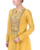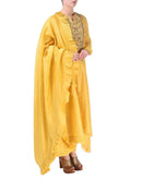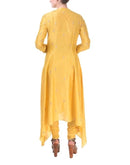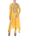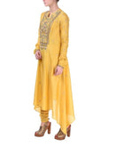 Featuring an alluring yellow cotton silk asymmetrical Kurta with an embroidered yoke in silk yarn, zari, sequins & beads. It is paired with a matching churidaar and topped with an organza dupatta that has pleated ruffle border.
