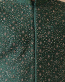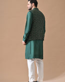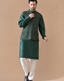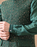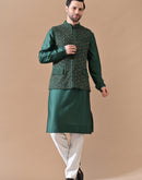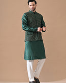 A striking forest green waistcoat crafted in cotton silk, adorned with intricate hand embroidery featuring fine beads, sequins, and zardozi work that create a richly textured surface for statement occasion wear.