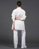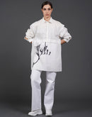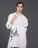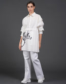 White, stylish, loose-fit, cotton shirt with digital print on it