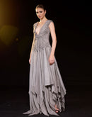 This ethereal golden gown features a sleeveless bodice adorned with intricate floral and sunburst embroidery Fabric: Cotton silk Embroidery details: Silk thread & zardozi embroidery Set of: 1 Colour: Grey...