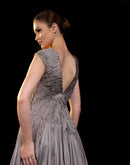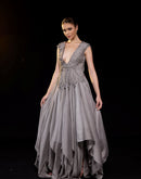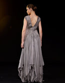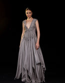 A striking grey gown features a deep V-neckline and delicately ruched bodice