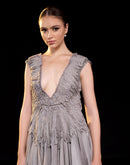 A striking grey gown features a deep V-neckline and delicately ruched – samantchauhan