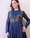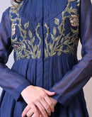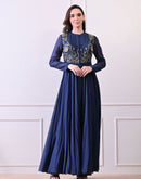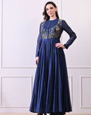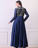 A sophisticated long blue dress showcasing subtle floral embroidery – samantchauhan