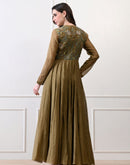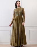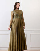 A sophisticated long olive dress showcasing subtle floral embroidery