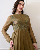 - A sophisticated long olive dress showcasing subtle floral embroidery