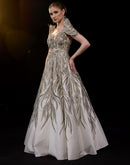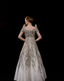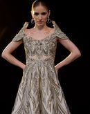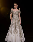 This elegant gown features an off-shoulder design with structured sleeves and intricate metallic embroidery. The bodice showcases a floral motif