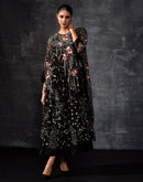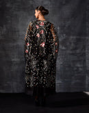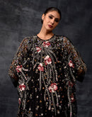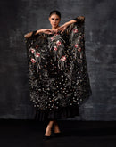 Turn heads in this enchanting black cape kaftan, beautifully adorned with intricate floral embroidery in hues of pink, white, and gold.  Fabric: Cotton silk & net Embroidery details: Silk thread...