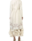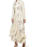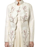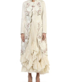 Ivory cotton bustier ruffle inner Dress with scallop front-opening mandarin collared jacket embroidered floral motifs of silk & zari yarn highlighted by top-stitch.