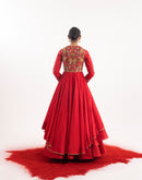 Radiant two-piece ensemble: a red embroidered anarkali crafted in luxurious cotton silk fabric, showcasing timeless elegance and intricate detailing.