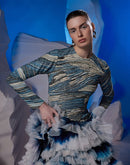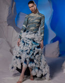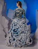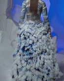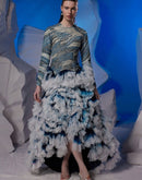 Graceful ivory high-low hem gown with an ombre ghera and net frill, featuring a high neckline enhanced with silk thread and Zardozi embroidery on the yoke.