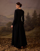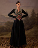 An elegant black gown with striking red and green floral embroidery on the V-neck bodice, featuring long sleeves and a flowing silhouette