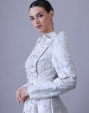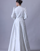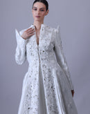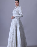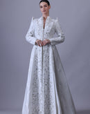 Make a bold and timeless statement in this regal full-sleeve gown, designed with structured shoulders and adorned with intricate floral embroidery. The high collar paired with the sweeping floor-length silhouette creates a perfect harmony of traditional elegance and contemporary refinement.