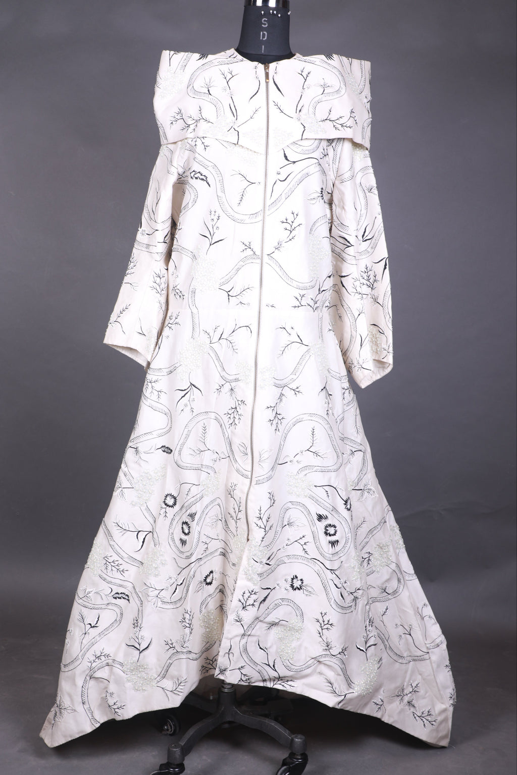 Design: An elegant off-white gown featuring intricate black silk-thread asymmetrical embroidery that extends into a dra...
