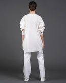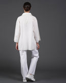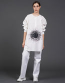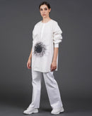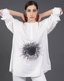 White, stylish, loose-fit, cotton shirt with digital print on it