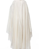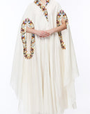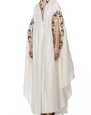 Ivory relax-fit floor-length lapelled collared cut-out sleeves Cotton Silk Kaftan, embroidered floral motifs of colourful silk & zari yarn.