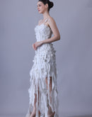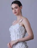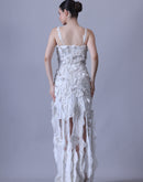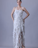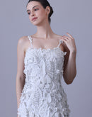 Turn heads in this ethereal strappy ivory gown, adorned with delicate 3D floral appliqués and elevated by a striking high-slit hem. The asymmetrical textured layers bring a whimsical, nature-inspired charm, creating a perfect blend of elegance and modern allure.