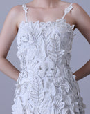Turn heads in this strappy white gown featuring delicate 3D floral appliqués